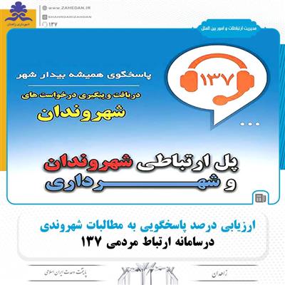????مدیر سامانه ۱۳۷ شهرداری زاهدان گفت: شهرداری منطقه ۳ با ۸۹ درصد پاسخگویی ، رکورددار انجام مطالبات شهروندان ساکن محدوده شهرداری منطقه ۳ در تیر ماه جاری شد.